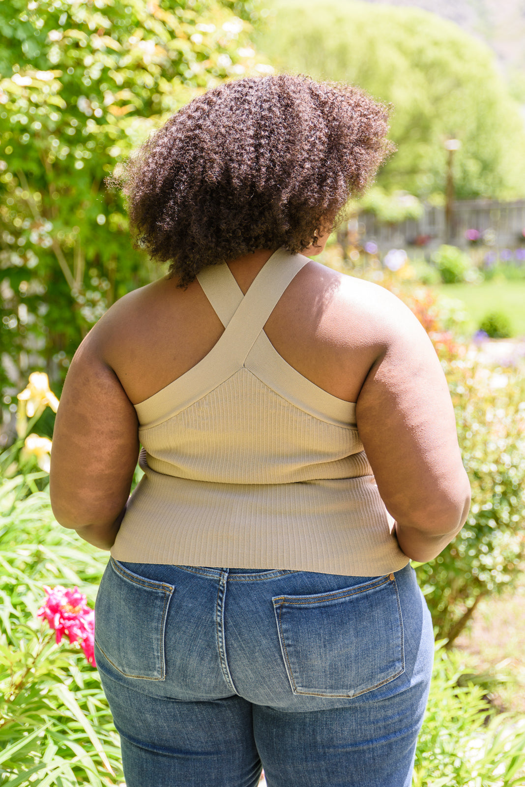 Elevate your outfit with the simple yet stunning details of the Criss Cross Halter Top in Tan. This top features a criss-cross halter style neckline, stretchy thick rib knit, and a body-hugging silhouette.